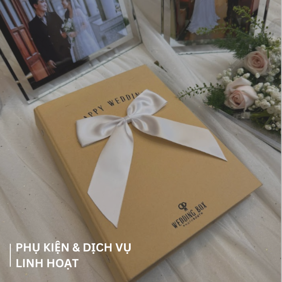 Wedding Box cung cấp các phụ kiện chụp ảnh và dịch vụ tùy chọn (trả phí), cho phép cá nhân hóa theo phong cách và concept của cô dâu – chú rể, giúp trải nghiệm chụp ảnh thêm trọn vẹn mà vẫn giữ sự tinh tế của tiệc cưới.